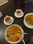 Мясной бульон, кокосовое молоко, помидор, ананас, шампиньоны, креветки, кальмары, рис на пару