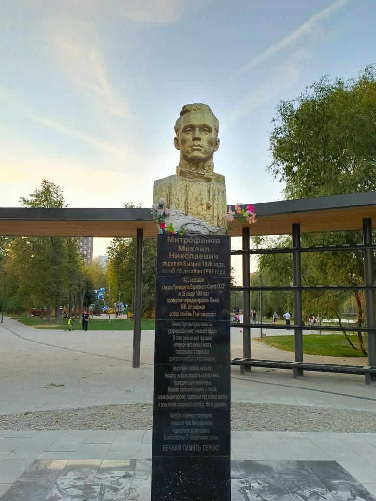 Довольно скромный памятник не очень ухоженный и подойти к нему, из-за реконструкции парка, затруднительно. Но если вы всё- таки до него дойдёте, то узнаете какой подвиг совершил Михаил Митрофанов и почему в честь него названа улица. Это очень хорошо, что такой памятник есть. Я надеюсь, что с реконструкцией парка, памятник тоже приведут в порядок.