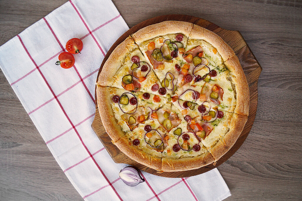 Сливочный соус Шеф,сыр моцарелла,ломтики бекона,свежие томаты,шампиньоны,болгарский перец,маринованное куриное филе