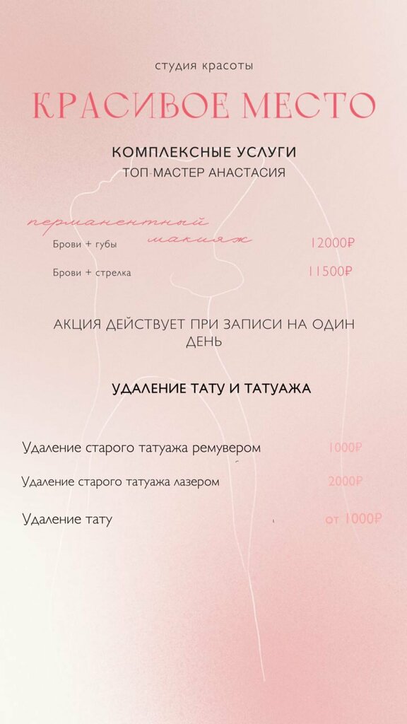Делала в этой студии перманент бровей и губ у мастера Анастасии ! Очень отзывчивый и клиентоориентированный мастер! Все сделала безболезненно ! Результатом осталась полностью довольна! Хотите подучить услугу не дорого, а главное качественно, и что все будут узнавать где вы ее делали, приходите сюда ! Девочки в студии все профессионалы ! Спасибо вам !
