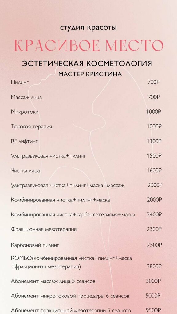 Отличный салон красоты. Место крайне ухоженное, видно, что косметологша парится о стерильности. Я записался на чистку лица. Мастерша Кристина всего за 2500 рублей почти полтора часа бережно и тщательно удаляла мои чёрные точки. А также дала множество советов по лечению и уходу за кожей. Результаты действительно видны. То, что я считал "маленькими прыщичками" - это и было чёрными точками. И я избавился от большинства дефектов моего лица.