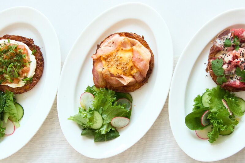 Хрустящий картофельный драник с лососем, свежим огурцом, сметаной и зеленью