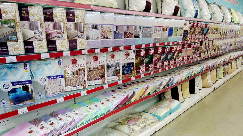 Много постельного и посуды. Брали комплект кастрюль, всё хорошо. Помогали выбрать постельное, подобрали идеально под размер и цвета комнаты
