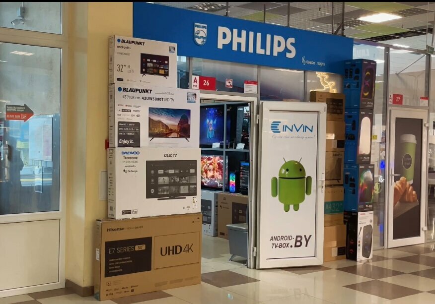 He sells some kind of Chinese TVs, although Philips advertising is everywhere, let him change the signs, you come for one and incomprehensible companies push you in.
