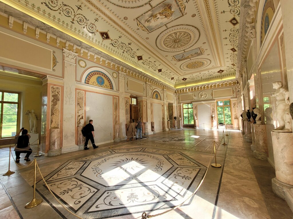 Концертный зал был построен в Екатерининском парке в 1788 году известным итальянским архитектором Джакомо Кваренги. Жемчужиной концертного зала является уникальная античная черно-белая напольная мозаика конца II – начала III века, привезенная в Царское Село из Рима в 1784 году. Мозаичная композиция изображает известный мифический эпизод похищения Европы, дочери финикийского царя, богом Зевсом, принявшим образ быка.