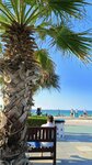 A large beach strip. The entrance to the sea is shallow. But there are no benches in the beach area, only in cafes and other retail outlets, for this you need to change clothes. The shadow of a palm tree is far from the entrance to the sea.