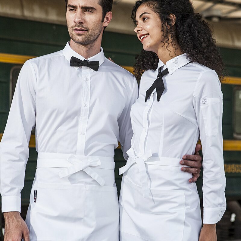 Фартук из чистого хлопка с бамбуковым переплетением. Длина фартука регулируется с помощью 3 кнопок на шейной лямке; Два больших боковых кармана по бокам; Три варианта длины: длинный с грудкой, короткий с грудкой и вариант без грудки.