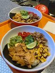 Обжаренная курица с рисом в соусе сладкий чили, а также с гуакамоле, тортильей, салатом из красной фасоли, помидора, кукурузы, красного лука, кинзы. При остром варианте добавляется нарезанный перец халапеньо и соус Табаско