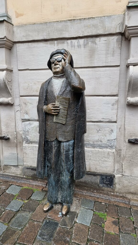 Evert Taub is a poet, composer, and singer whose works are still popular in Sweden. On the Iron Square, the composer is depicted in full height, wearing glasses and holding a newspaper in his hands, according to one version, he is depicted waiting for a taxi.