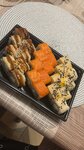 Мидии, сыр творожный Cremette, огурец, лук перо, соус спайси, кунжут. Ккал - 287,3, белки - 7,6, жиры - 6,7, углеводы - 49,0