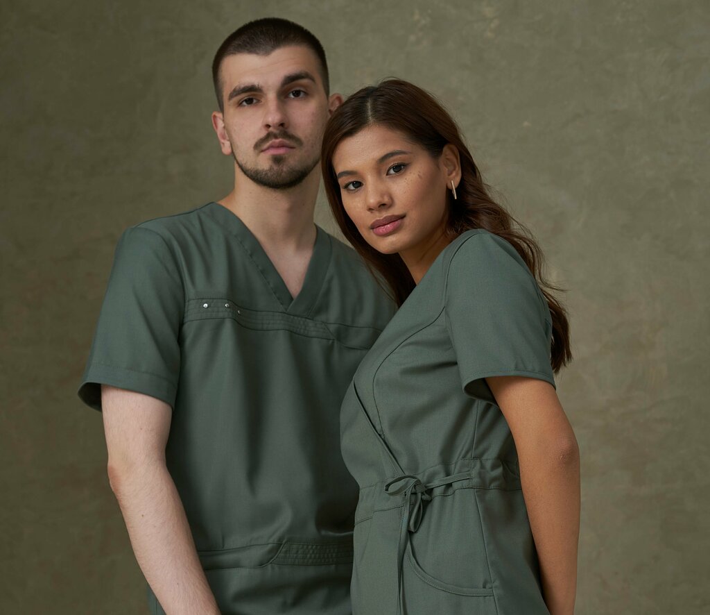 73% ПЭ 21% район 6% спандекс Модный топ с трикотажной отделкой. Эластичная ткань высшего качества обеспечивает комфорт, необходимый медицинским работникам при их высоких нагрузках. Ткань лёгкая, отводящая влагу.