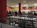 Большая столовая- это плюс, работает целый день, есть мощные кондёры, туалет - это плюс, вкусная еда - это плюс. Столы и стулья могут не быть ввтертыми, но скажешь, протирают. Зубочистки ищите на подносе у кассира, почему не на столах? Кофе часто готовит кассир, если есть очередь, то вам его могут и не подать, ответ - не успевают сделать. В целом норм
