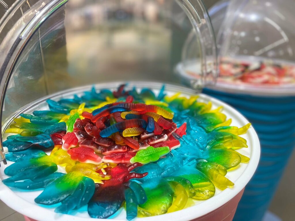 Персонал вежливый добрый, все обставлено разными угощениями, есть автомат с напитками, стенд с чипсами и многое другое, мармелад распределен на стойки в рядах, 2 сладких 1 кислый, люблю брать бутылочки и кислую синюю малину, все нравится :)