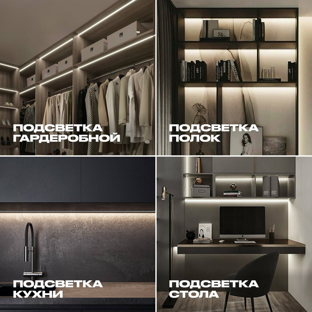 Собственное производство Защищен от воды и пыли Плавное свечение благодаря премиум ленте 120 д/м Премиум LED - лента Touch-кнопка Гарантия 2 года