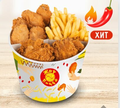 2 аппетитных хрустящих цыплёнка, 8 ароматных острых крыльев и ломтики картофеля фри.