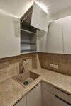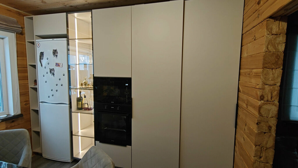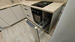 Благодаря угловой форме мы задействовали максимальное количество полезного пространства без потерь площади: - фасады – до самого потолка с дополнительным местом для хранения кухонной утвари, - правее разместили пенал со стеклянными стеллажами и по...