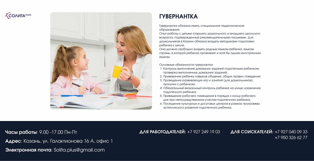 Дважды обращалась в эту фирму в поисках работы няни. И они всегда помогали в этом. Быстро и оперативно происходит поиск работодателя и вас сразу назначают на собеседование. Перед собеседованием консультируют, наставляют, успокаивают, дают рекомендации. Благодарю вас за предоставление работы!