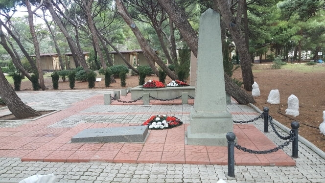 Чистый сосновый бор с косыми соснами , могучий микс хвойных фитонцидов и морского бриза, возвращает к жизни любого заморенного выхлопами горожанина и приезжего с промышленных и переполненных Человейников. На окружающих полянках и хвое, лежбища жаждущих свежести ,покоя и медитации. Люди просто спят ,дремлют ,читают ,глядят в небо ...Памятник вроде бы не к месту ,но тем не менее органично вписан в ауру этого места , нечто приземлющее местные эмпиреии раслабона и патрицианского возлежания. Место чистое ,солнечное как вальгала для павших героев той войны...
