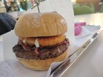Котлета из мраморной говядины, карамелизированный лук, сыр Чеддер, бекон, соус фирменный