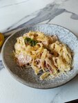 Паста тальятелле с обжаренными креветками, помидорами черри в сливочном соусе