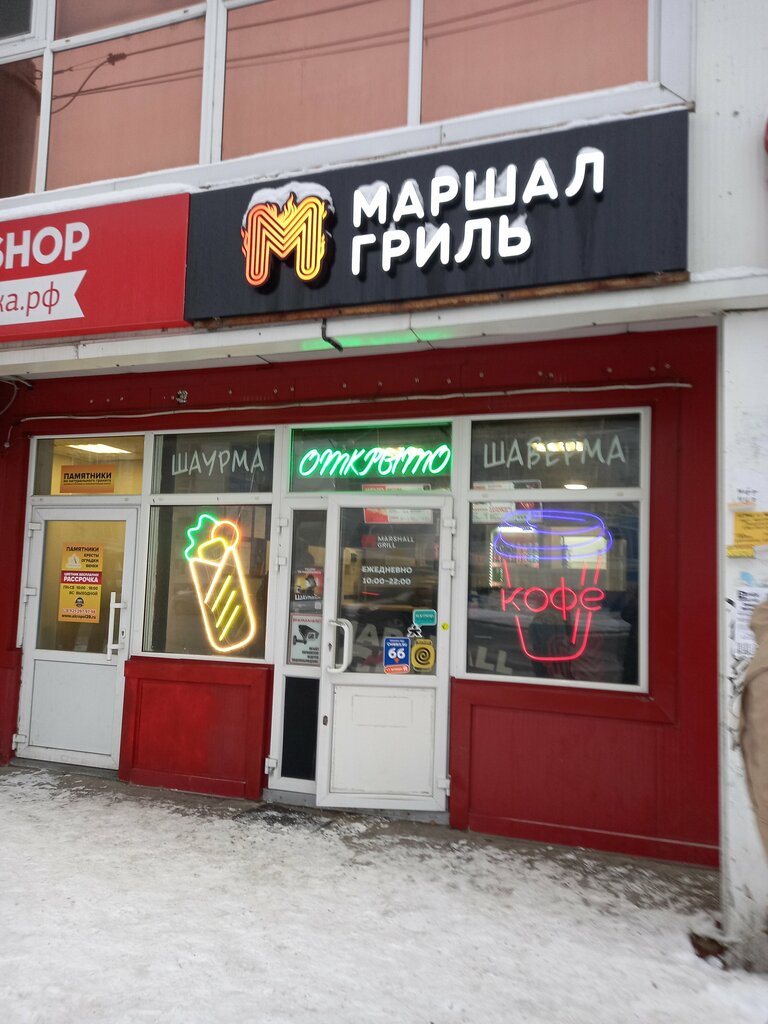 Отличная шаурма, самая вкусная в городе! Лояльный персонал и непревзойденный вкус, всем рекомендую Всю жизнь не особо любила шаурму из-за плохого мяса внутри и малого количества овощей, но в маршал гриле идеальная курица, пропорциональное количество овощей, шаурма сочная, яркая, сытная, что особенно важно, она не жирная, в общем, могу пожелать только процветания)