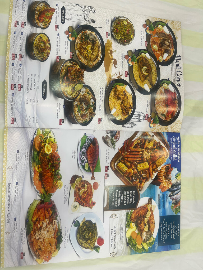The food is delicious, they can cook your fish from the market, but there is also a decent menu. Very tasty seafood soup for 15 dirhams, grilled seafood is also great. The juices are freshly squeezed and good. I threw the menu in the photo