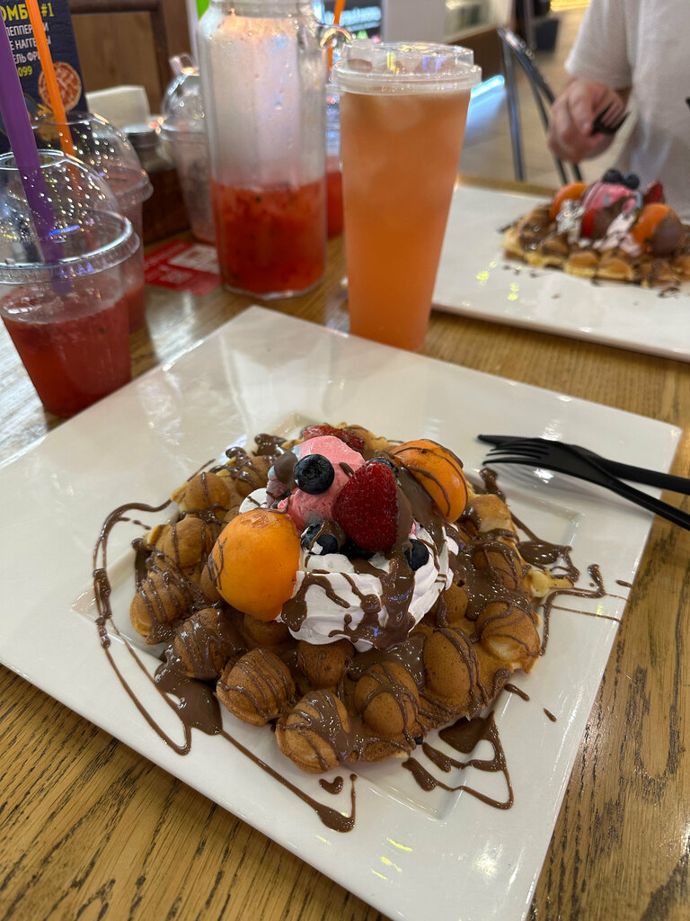 Здесь вас ждёт быстрое обслуживание 🚢 и качественные десерты 🍰. Особенно рекомендуем попробовать гонконгские вафли , политые шоколадом 🍫 ягодами, с шариком мороженого 🍦 — это очень вкусно! Также вам понравятся молочные коктейли 🍹 и смузи 🥤.