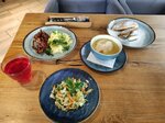 There is no service. You need to catch the waiter and beg for the menu literally. They asked — they brought the business lunch menu and fuck off, as they say. They asked for the second time to bring the main thing. And then they decided to offer us to order manti, since we had already asked for the main course, it's not clear what… The tables are dirty, there are no napkins, the spices are dirty and rusty, ugh. Food and drinks: Americano was brought without foam, as if it had stood for 10 minutes. It doesn't taste good. The cappuccino looked good. The waiter brought it to each mug without asking about sugar, why if we didn't ask? I ordered borata with tomatoes and tom yam. The cheese seems to be overexposed. It was too dry and hard. The balsamic sauce was literally smeared all over the plate. The dish looks strange. There were not enough spices and the cheese was questionable, it was not tasty. The shrimp in that pit could have been cleaned normally. And then one is peeled, the second is partially in the peel. You can pick at it with your hands in the soup. Not the best tom yam, about 3 out of 5. Having put everything together, I do not recommend it. The service and food do not match the prices. Even at a gas station, you can get much better service by buying just coffee.