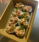 Тунец, сыр творожный, омлет тамаго, помидор, рис, нори, кунжут, соус спайси, лук зеленый. Вес блюда может отличаться +/- 20 г. Входит: имбирь, васаби и соевый соус.