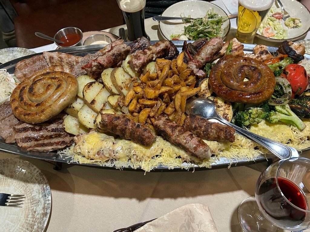 Куриное филе с сыром в беконе, свиная шея, куриный окорок, чевапи, лесковачки уштипак, фаршированная плескавица, плескавица для гурманов.Подается с картофелем на гриле,овощами на гриле,маринованной капустой, томатным и сербским соусом урнебес