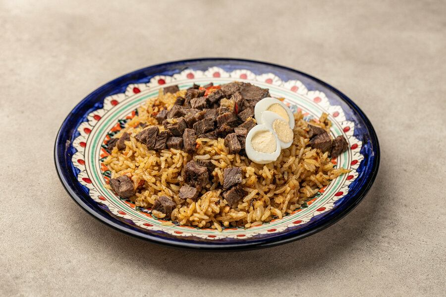 Хотите попробовать настоящий горячий плов? Это блюдо из категории Горячие блюда готовится из нежной говядины, сочной моркови и лука, а также пряного риса с зирой. Украшается перепелиными яйцами