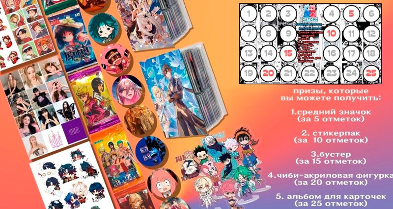 В данном BOX'е вы найдёте товары, со случайными изображениями героев аниме: JOJO Фигурка акриловая - 1шт. Подушка А4 -1шт. Кружка керамическая - 1шт. Постер А3 ламинированный - 3шт. Стикерпак - 2шт. Значки - 6шт.