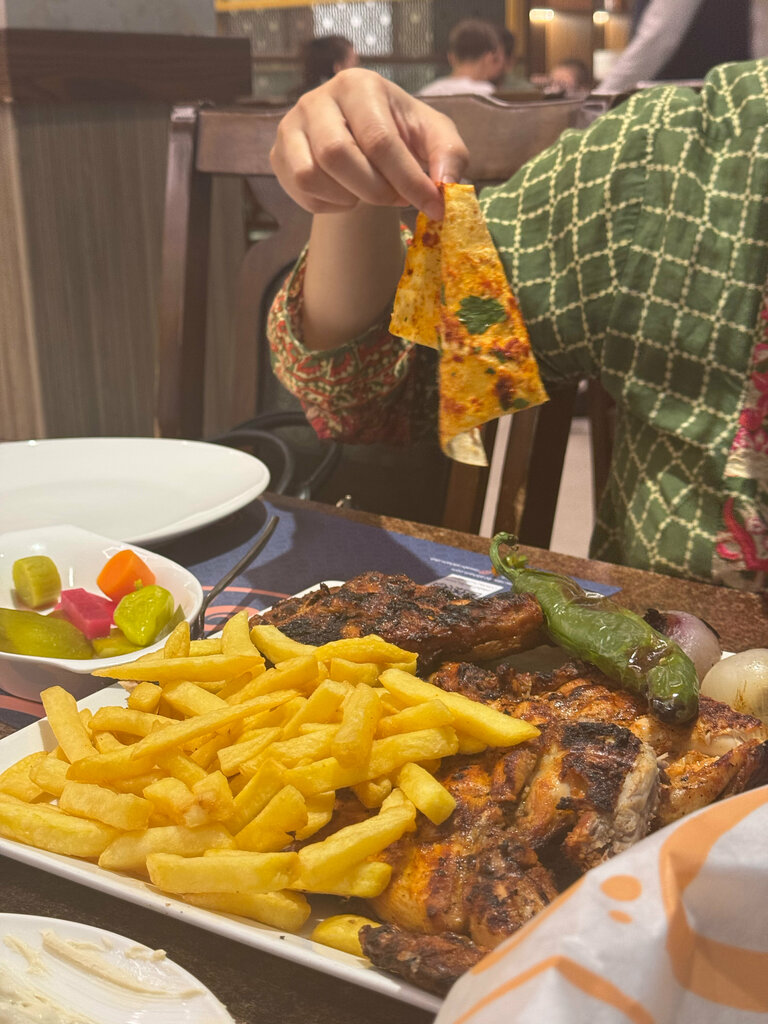 Grilled chicken is best. They serve best breads in the town. They offer brown bread pair with white bread. It’s so crisp and hot. Enjoy with falafel and hummus. Their meat cutting is good , fresh meat. Good quality of food. Atmosphere is fine to spend time with friends or family but dinning hall is bit small not much fancy items established here. On the ground floor they have meat shop.