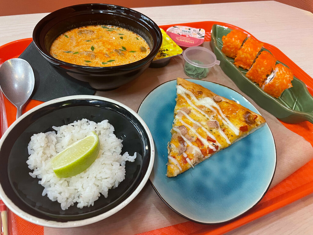 Variety of food:sushi and rolls, pizza, fixed meal