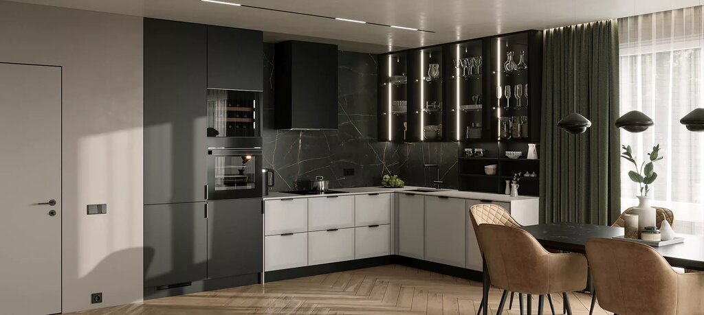 Кухонный гарнитур выполнен в минималистичном дизайне и эффектно смотрится на кухне в современной стилистике