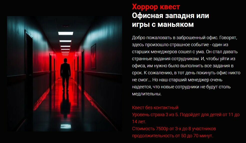 Quest types:horror, on films and games, post-apocalypse, harry potter, for beginners, detective, mystical, for teenagers, difficult, dynamic, performance, adventures, cheerful, with children, inexpensive, nonstandard, quests with actors, for schoolchildren, quests