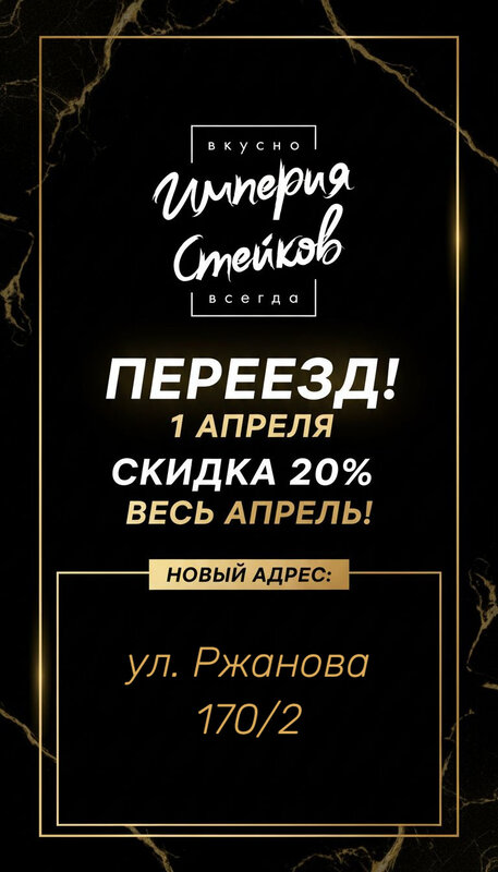 Обожаем всей семьей магазины «Империя Стейков» всегдя выручают на любые мероприятия, семейные встречи, просио вкусный ужин😋 можно дополнительно купить вкусную соль, наша любимая черная и винная. В общем всегда все на высоте, кстати локации у магазинов очень удобные, что тоже важно👍🏻