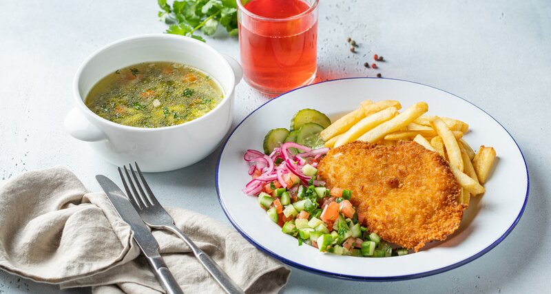 Суп на выбор: Борщ/ Креплах (С пельменями)/ Чечевичный Горячее на выбор: Кебаб на тарелке/ Шиштаук на тарелке/ Шницель на тарелке/ Шакшука классическая/ Шаварма в пите Свежая пита и Напиток Предложение действует с 12:00-16:00 по будням