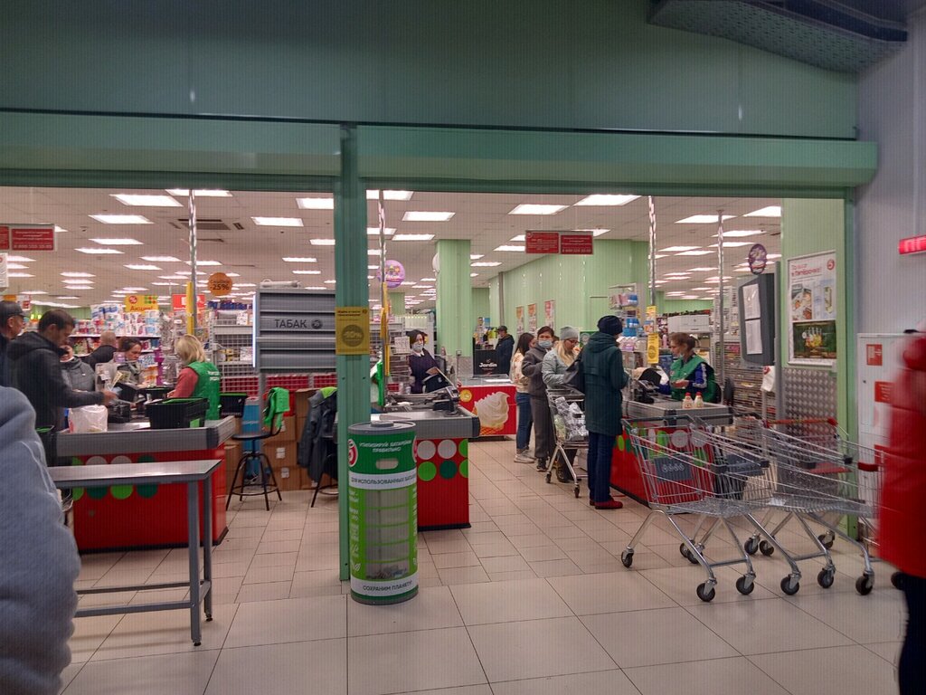 Вежливый персонал, товар по акции всегда в наличии, свежие продукты, что сказать по поводу очередей в кассы, а где их сейчас нет, быстрое обслуживание, наличие четырёх касс самообслуживания, что я считаю очень удобным. Посещением довольна,буду заходить ещё.