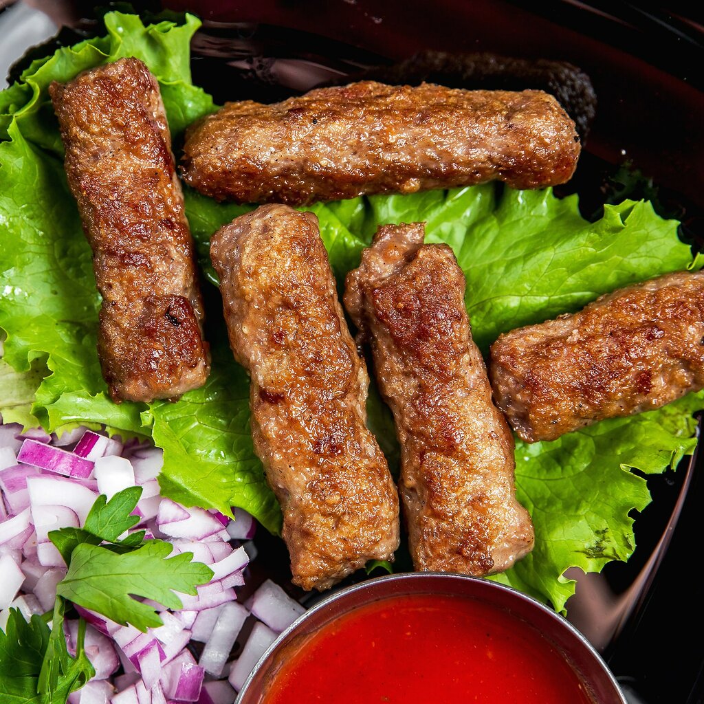 Чевапчичи из мраморной говядины, завернутые в бекон. Подаются с картошкой-фри, капустой и соусом.