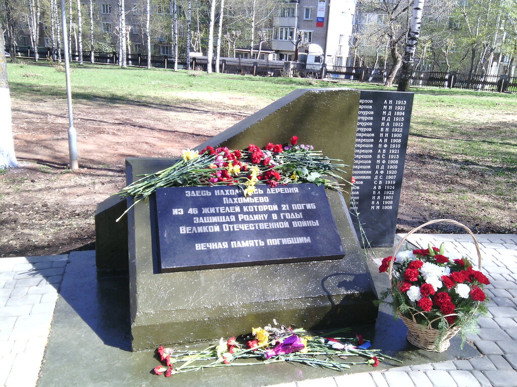Парк Победы. Памятник жителям деревни Пахомьево, из 46 жителей которой 21 погиб на войне. Деревня Пахомьево находилась на этом месте, ещё в 80-х здесь оставались стоять 2 деревянных деревенских дома.