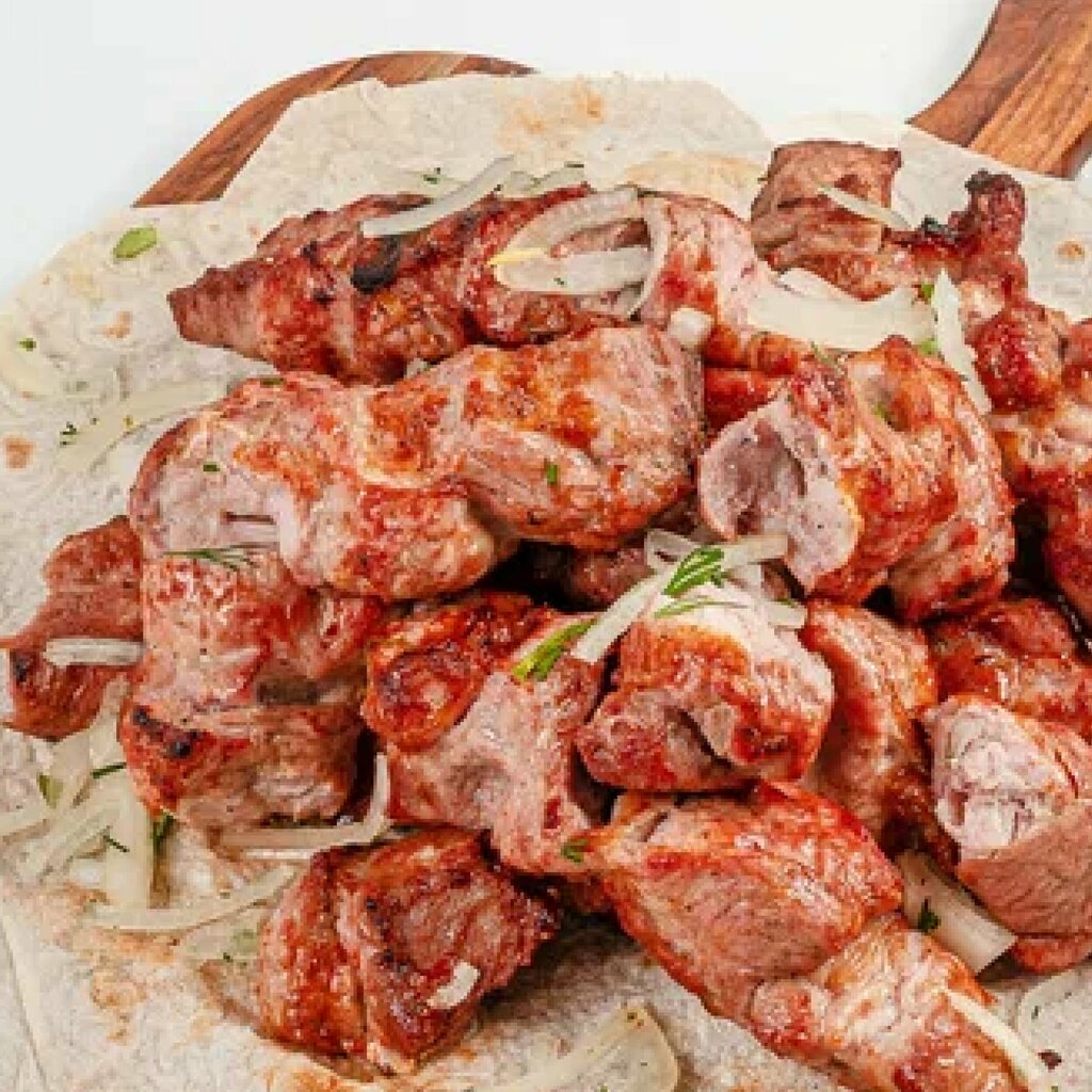 Сочный шашлык из свиной мякоти в классическоком маринаде с добавлением лука и специй