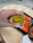 Рубленый бифштекс из натуральной цельной говядины с кусочками сыра Чеддер на карамелизованной булочке, заправленной горчицей, кетчупом, луком и кусочком маринованного огурчика