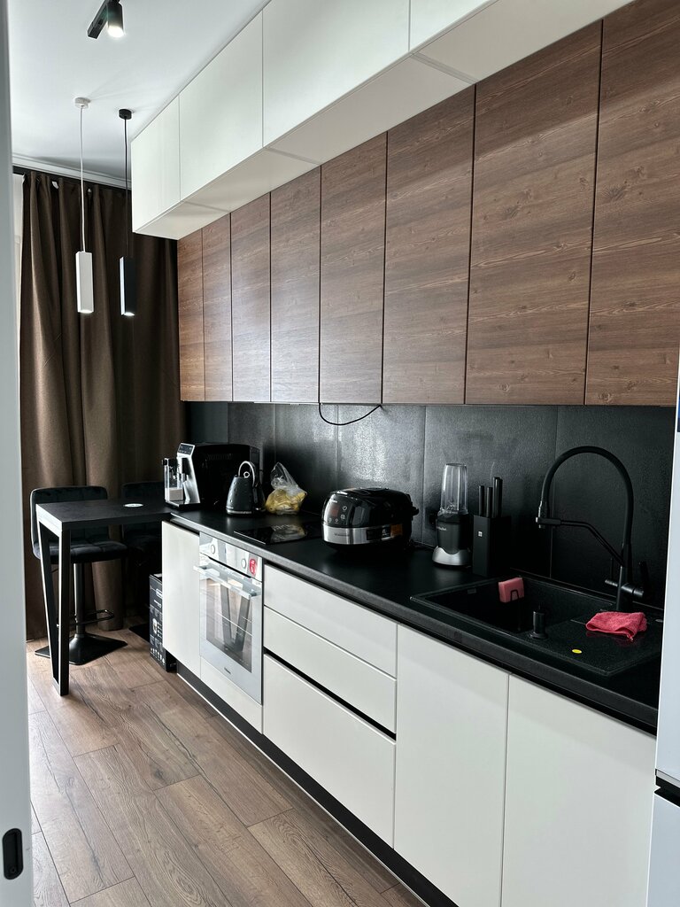Корпус: ЛДСП16мм Фасады: МДФ в пленке ПВХ Петли: Formenti & Giovenzana + Блюм Выдвижные ящики: Скрытого монтажа Столешница: Столешница HPL пластик Метод открывания: Скрытый профиль SCHUCO В подарок: мойка и дозатор