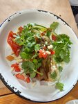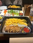 Начнём с того, что мы были в среду, мужчины хотели заказать немного водки, но не было никакой водки. Далее следует отметить достаточно долгое обслуживание, при условии абсолютно свободного зала. Салат из баклажан был неплохой. Практически все блюда без гарнира. Причём нельзя заменить имеющийся гарнир, выбора нет. Порция рёбер смешная. Категорически невкусно креветки. Официантка честно предупредила, что порция маленькая, но это в итоге оказалось 10 -12 самых маленьких креветок, очень жёстких, холодных и в абсолютно пресном соусе. Наггетсы детские были пересушены. В целом не то место, куда хочется вернуться еще раз.