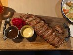 Вот где можно познакомиться с мужчинами, их видимо не видимо (дамам на заметку😉)правда все увлечены на широком экране футболом и обсуждением тем их интересующих, но все же. Итак, про само заведение! Давольно чисто, официант знал меню, на вопросы отвечал без запинки. Порции в меню указаны без граммовки, что очень неудобно. Одно из блюд заказали килограмм ребер (в килограмм входят ребра, картофель, овощи) костей много мяса на них с гулькин нос. 3 человека остались голодными. Что касается салатов, также маленькие порции. Да и в соотношении порция - цена не соответствует, на мой взгляд. Понравились ли мне ребра, ела и повкуснее. Пиво понравилось без горчинки и легкое.