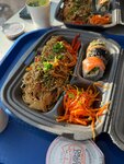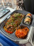 Однозначно 5 звёзд. Отличная кафешка. Взяли там wok-комбо, которое стоит 580 рублей. Состоит этот набор из горячего блюда на выбор из трёх, небольшой порции корейской моркови, трёх роллов на выбор с витрины и напитка 200 мл (чай или мохито). Горячее блюдо отличное. Взяли рис с курицей и лапшу с курицей. Много курицы (качественная мягкая грудка), перец, лук. Немного жирновато, но хорошо по-азиатски. Корейской моркови крайне немного, но она свежая, хрустящая и не особо пряная. Морковь вкусная. Роллы тоже достаточно хорошие. Рис нормальный, рыба и сыр качественные и вкусные. Напиток простенький, мы взяли без льда. Напиток из чуть сладкой воды, лайма и мяты. Ну, мохито и не соврёшь. Вкусный напиток, мята не горькая. Место однозначно рекомендую! Единственный момент немного долгое обслуживание, но было в моменте много заказов. И в мой заказ сначала забыли положить роллы, но быстро исправили эту ситуацию. Всё хорошо.