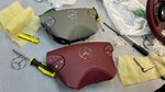 Андрей, помог закончить затянувшийся проект по реставрации руля и подушки AirBag для Mercedes-Benz CLK в 208 кузове. Те кто реставрировал руль, в конечном счёте отказались перетягивать AirBag? сославшись на то что нет нужных клише для теснения орнаментов на подушке и вообще, что нужных швейников сейчас нет, те кто шьёт аирбеги. Опустим то как я познакомился с Андреем, но он спокойно и без лишних вопросов принялся за работу и закончил её в сроки, которые меня поразили. Очень быстро. Предложил варианты клише для орнамента SRS AIRBAG, а для клаксонов (Дудки) нужного размера не оказалось в наличии, поэтому Андрей заказал его. В итоге AirBag перетянут с качеством не отличимым от заводского. Аккуратно вынул логотип Mercedes из другой подушки и интегрировал в новую. Строчка как заводская, цвет ниток идеально совпадает с нитками на руле. Я очень доволен работой. На прилагаемых фото, вверху бежевая заводская подушка, купленная в Звезде столицы, внизу исполненная Андреем