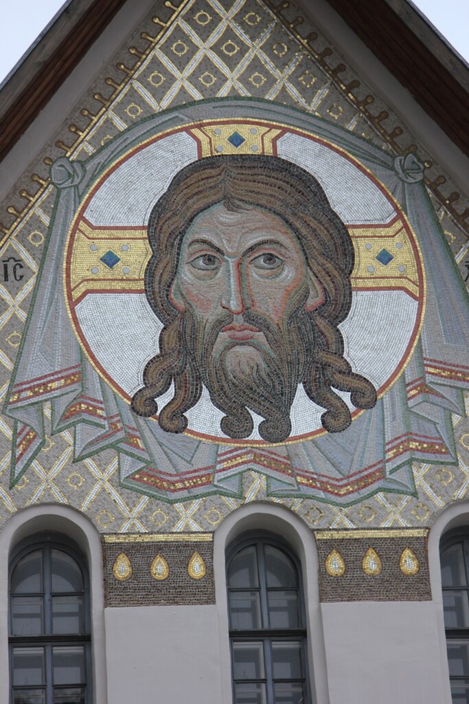 Интересное здание с красивой мозаикой.