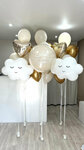В наборе: Большой шар (60см) с вашей надписью Фигура "Облако" Сердце (45см) с вашей надписью Звезда (45см) на грузике Связка из 8 шаров: 10 шаров под потолок: